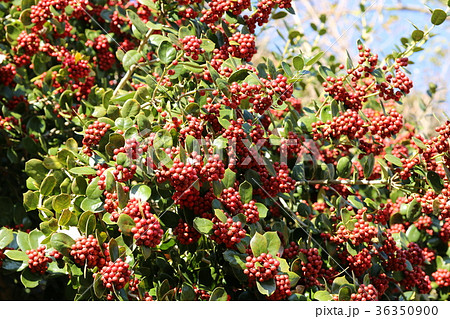 艶やかな緑色の葉に鮮紅色の丸い実がたくさんついたヤバネヒイラギ