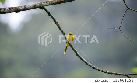Orange Minivet female (Pericrocotus flammeus) bird perch rear view shot.