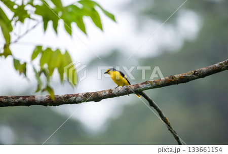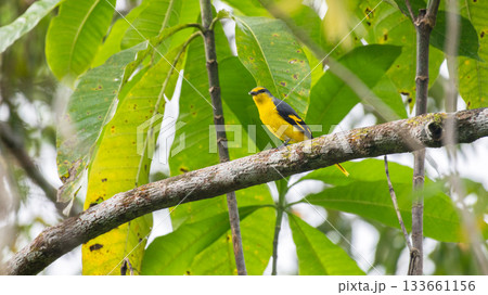 Orange minivet female (Pericrocotus flammeus) bird perched in a tree branch at Sinharaja Forest Reserve
