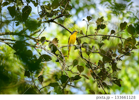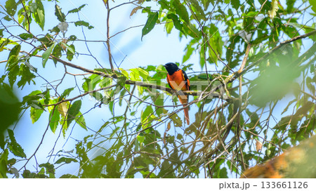Orange minivet male (Pericrocotus flammeus) bird perched in dense tree canopy at Sinharaja Forest Reserve