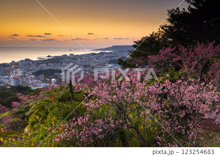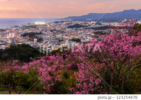 沖縄県名護市 名護城公園さくらの園の早咲きの琉球寒緋桜と街の夜景越しの名護湾の夕焼け