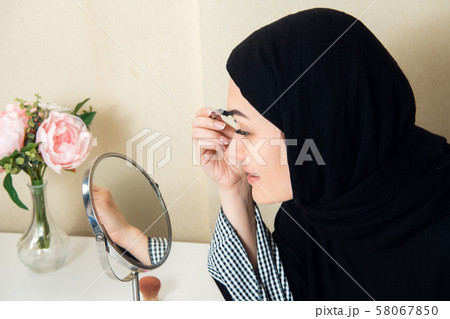 Beautiful muslim woman applying mascara. Young arab woman using lash brush