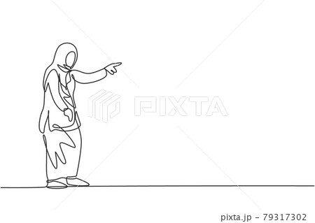 Single one line drawing Arabian woman pointing away hands together and showing or presenting something while standing and smiling. Emotion and body language. Continuous line draw design graphic vector