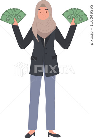 Financial Success concept. muslim Woman in Hijab Holding Money Fan in both hands.