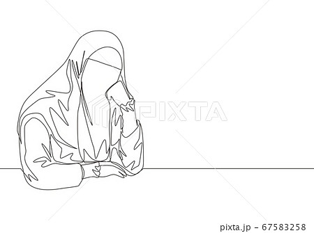 Single continuous line drawing of young pretty saudi arabian muslimah wearing burqa and pensive seriously.