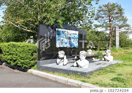 島田市 島田宿大井川川越遺跡石碑と川越人足モニュメントと新緑