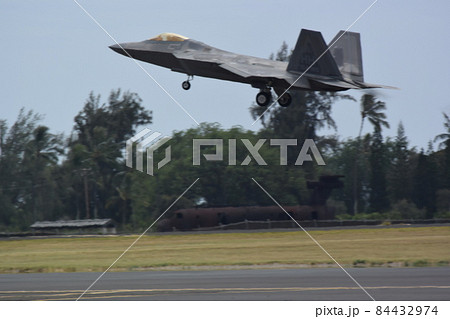 ハワイのヒッカム統合基地に着陸する米空軍の戦闘機F-22ラプター