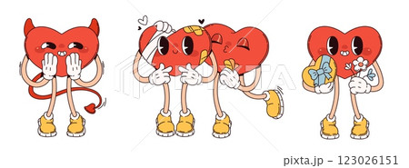 Groovy valentine love stickers and y2k stickers pack. Cartoon hearts, flowers, lips, peace symbols, love-related phrases and rainbows, sunglasses and sweets with retro hippie aesthetic and bold colors