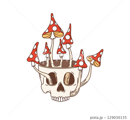 Human skull with mushrooms hippie groovy object. Witchcraft and Haloween horror isolated vector hippie retro symbol. Amanita mushroom growing from empty skull funky vintage 80s object or icon