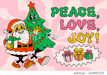 Groovy Christmas cartoon poster. vintage funny Santa Claus and Christmas tree with happy faces and peace love joy text. Ideal for Christmas and New Year sticker designs and decorations, vector