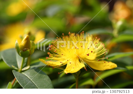Yellow Hypericum Hidcote (St. John s Wort). A summer background of a large yellow flower on a green bush