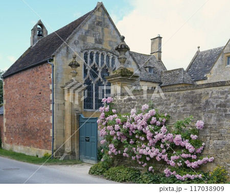 イギリスコツウォルズ地区に素敵なヒドコート・マナー・ガーデンの入り口に満開なピング色のバラの花