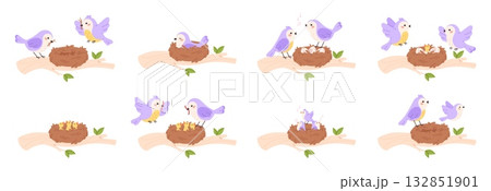 Bird family. Creating family, hatching and feeding chicks step by step. Birds feeds children in nest. Leaving home and freedom metaphor racy vector set