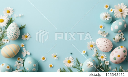 Joyful Easter celebration with colorful eggs and flowers on a cheerful blue background