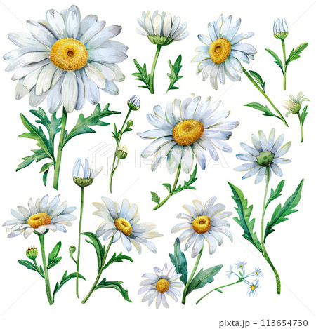Versatile watercolor pack featuring a variety of daisies bouquets, single flowers, and elements. Perfect for enhancing invitations, cards, and botanical-themed projects.