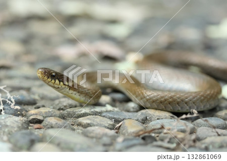 生き物 爬虫類 ヒバカリ、無毒でおとなしいヘビ。頸の後ろ側に回る白っぽい模様が特徴の一つ