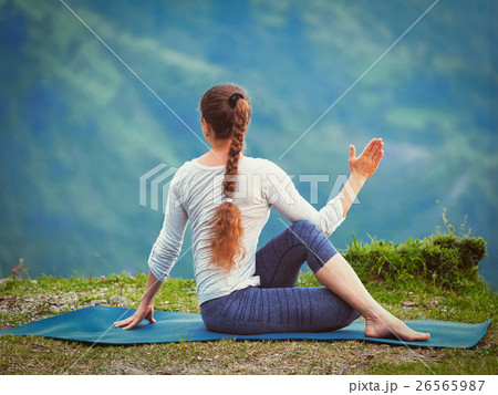 Woman practices yoga asana outdoors