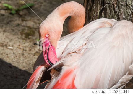 Greater Flamingo preening its feathers. Close up