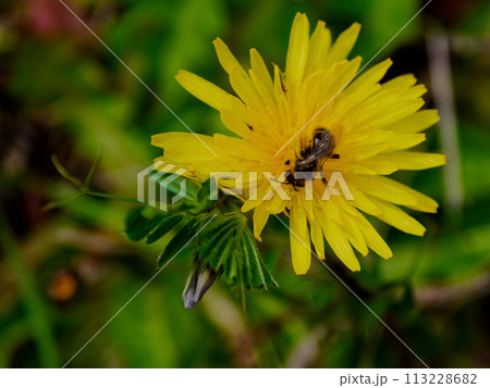 黄色いタンポポの花を這いまわるキバナヒメハナバチ(初夏の神田公園 '23)