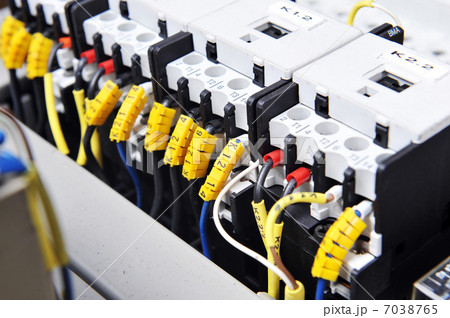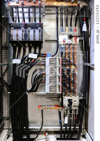 Terminals, contacts, circuit breakers wiring in electrical switchboard providing a safe supply of electricity