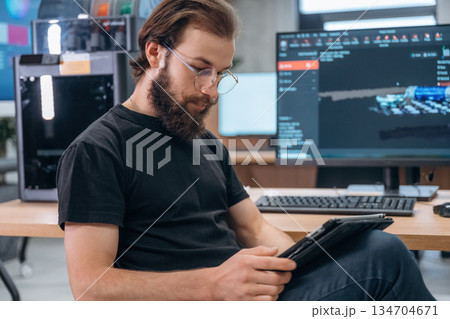 Side view, by computer with 3d printer. Man is in the modern office, one person