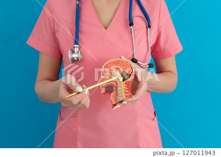 Anatomical model human head on work desk of doctor in medical clinic.