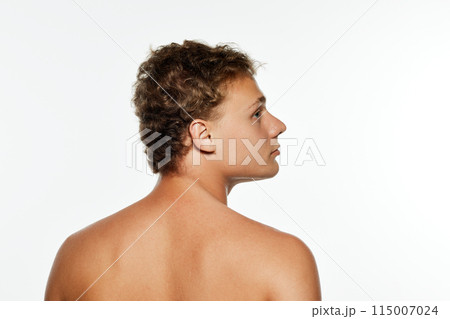 Rear view photo of young man with curly hair posing shirtless and looking away against white background.