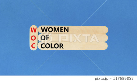 WOC women of color symbol. Concept words WOC women of color on beautiful wooden stick. Beautiful blue background. Business WOC women of color social issues concept. Copy space.