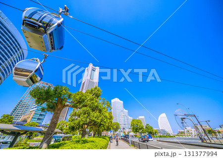 日本の横浜都市景観 ヨコハマエアキャビンの桜木町駅や横浜ランドマークタワー、あかいくつなどを望む