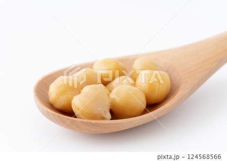 スプーンに載せたひよこ豆(水煮)のクローズアップ