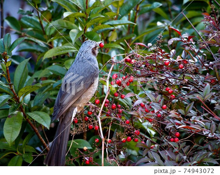 ナナカマドの枝に止まり実を鳴くヒヨドリ
