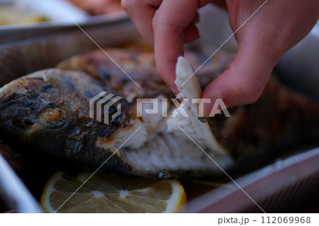 Someone is trying to eat fried dorado with their hands Cooking dorado fish with orange. High quality photo
