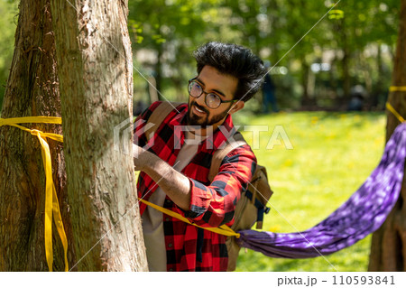 Young hindu man in checkered shirt feeling relaxed in hammock in the park