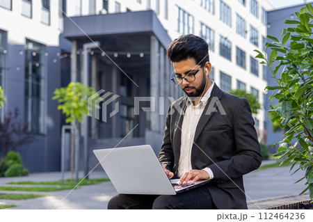 A young Indian man in a suit is sitting outside an office wearing headphones and a suit and is concentrating on his laptop.