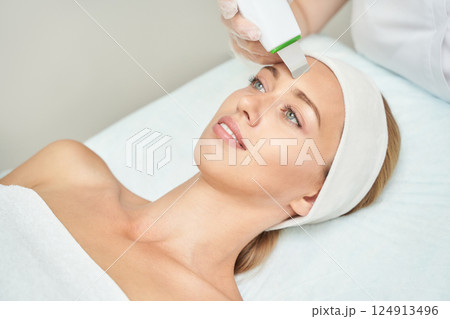 Young caucasian female receiving ultrasonic facial treatment in spa setting