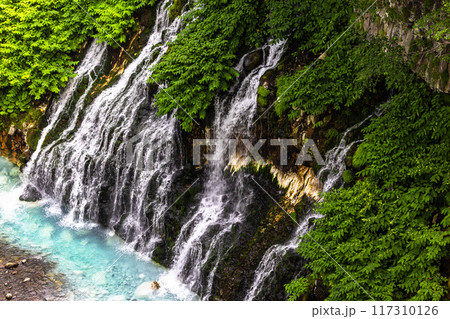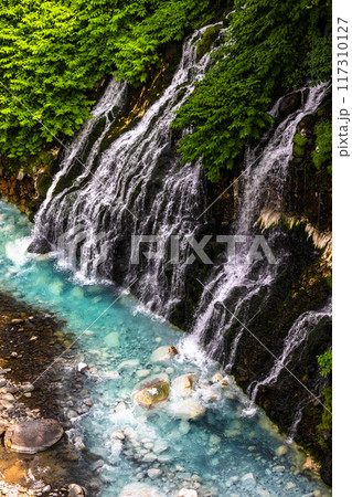 【北海道_美瑛_白髭の滝】青い色と白い滝のコントラストがよく映える、青い池