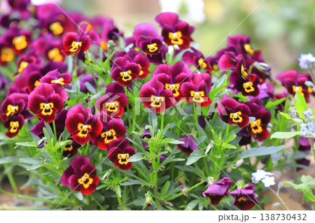 公園の花壇に紫色のパンジー(pansy)の花が咲いています。