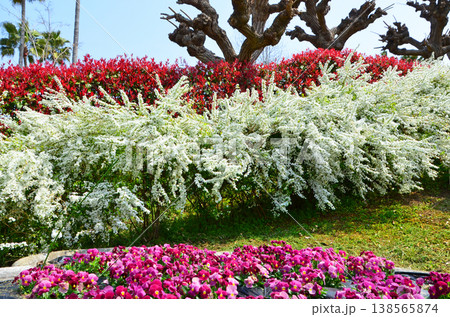 ユキヤナギとベニカナメモチ(レッドロビン)とビオラ