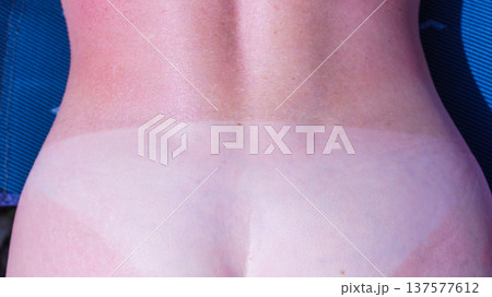 Sunburn from sun light on shoulders back and buttocks of caucasian girl. Woman sunburn. Body care