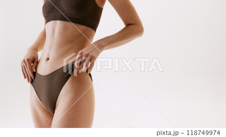 Cropped image of slim, fit female body, belly, buttocks and slender legs. Model posing in underwear isolated on white studio background