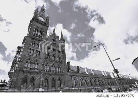 ロンドンのセント・パンクラス駅とキングスクロス駅周辺の歴史的な建築物 モノクロ写真