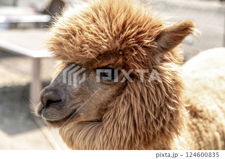 ペルー・クスコ近郊のアルパカ牧場でのキャラメル色をした毛刈り前のアルパカ