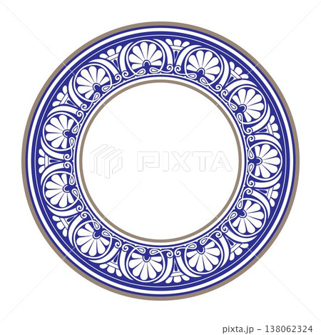 Decorative blue gold round plate with greek floral pattern. Round porcelain plate. Greek floral meander, palmette. European frame with pattern. Frame Ancient Greece, Roman Empire. Vector illustration