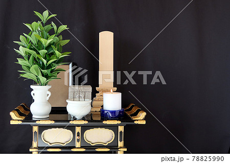 唐木仏壇に祀られた禅宗のお釈迦様の仏像と葬儀用の仏具2