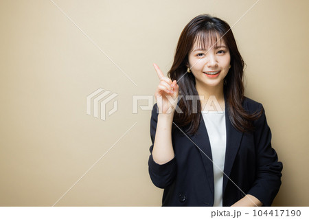 人差し指を立てるスーツ姿のミドル女性