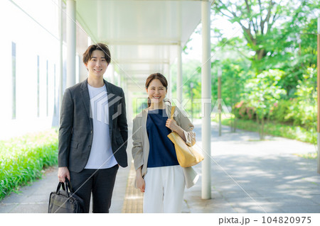 屋外を歩く男女オフィスカジュアル