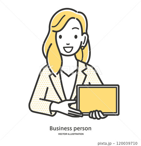 タブレットの画面を見せて接客対応をするビジネスウーマンのイメージイラスト素材