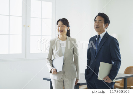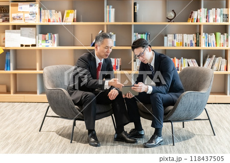 打ち合わせをするミドルエイジのビジネスマン2人 撮影協力:スカパー東京メディアセンター