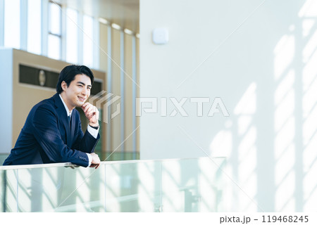 オフィスビルのロビーで考える男性ビジネスパーソン
