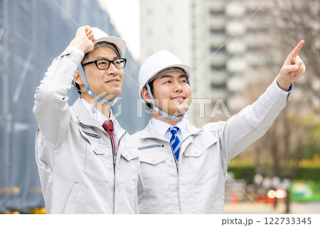 作業着で建築や施工などのパソコンの統計資料を説明する複数のビジネスマン 顔無しのバナー